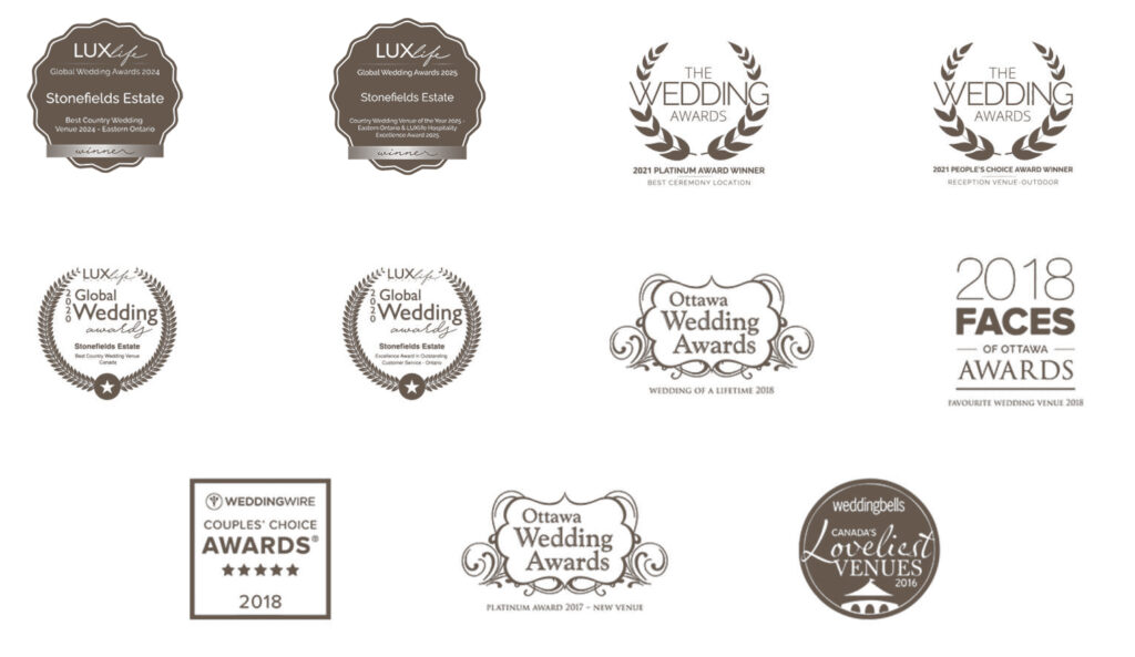 Stonefields Estate collects awards year after year. We’ve been twice-named Loveliest Wedding Venue by Weddingbells and we’ve won WeddingWire Couples’ Choice three times. We’ve also been twice recognized as the Best Outdoor Wedding Reception Venue at the Ottawa Wedding Awards in addition to The Wedding Awards’ People’s Choice for Best Ceremony Location. We have been honoured by Luxlife Global Awards for the Best Country Wedding Venue in Canada, Best Canadian Outdoor Wedding Venue, Most Unique Outdoor Wedding Venue and the Excellence Award in Outstanding Customer Service.